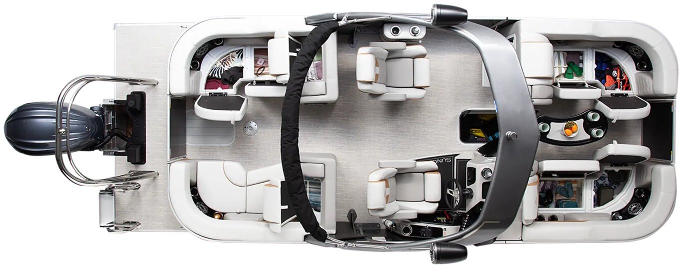Designed for comfort and control, the high-back bolstered captain’s chair is mounted on a raised platform for improved visibility. Attention to details, including SunCatcher branding, ensures durability and a refined look at the helm. |