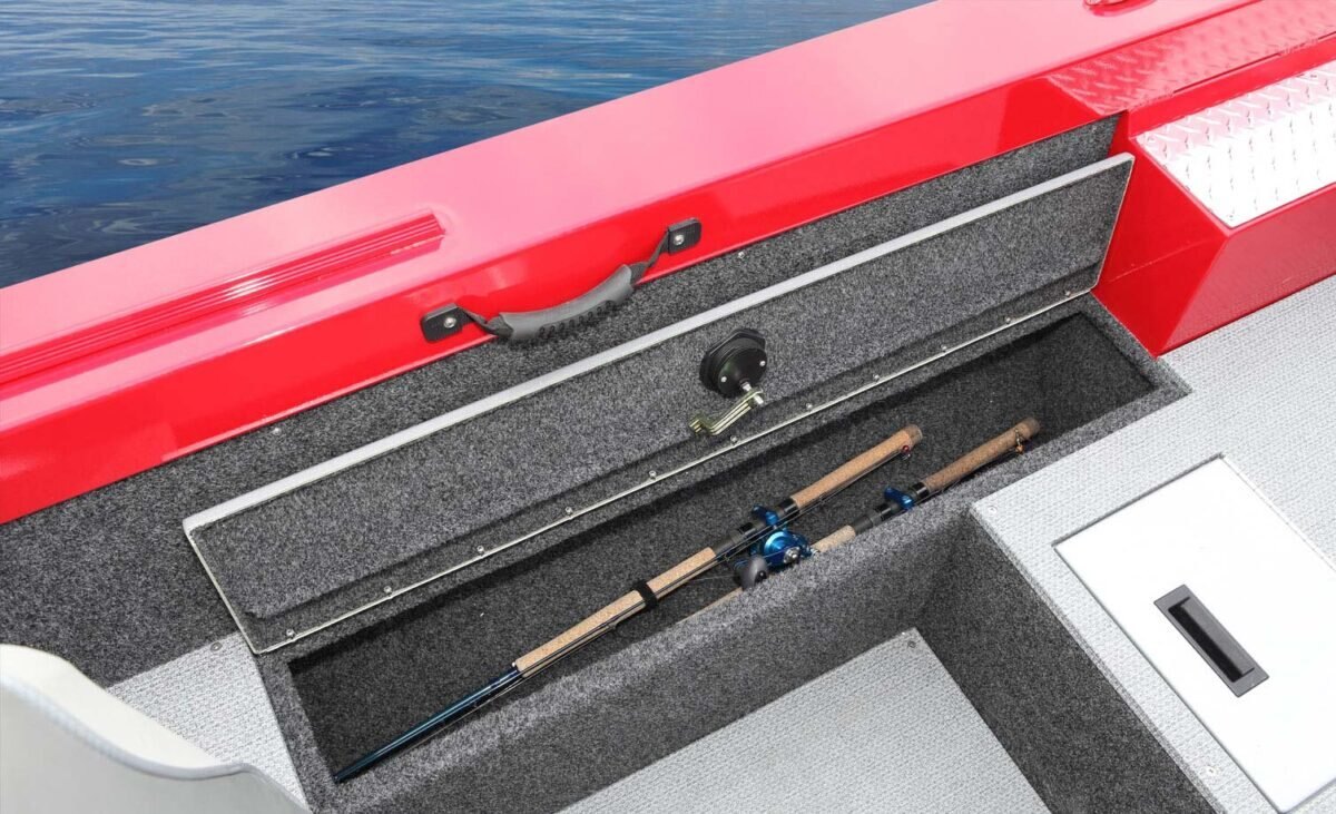 Raised bow platform with center rod storage for rods up to 8′ in length, dry storage compartments & battery locker for 3 trolling motor batteries